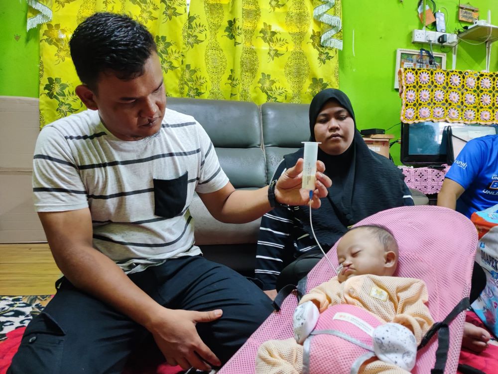 Mohammad Asri memberikan bayinya yang menghidap penyakit jantung berlubang dan sumbing meminum susu khas ketika ditemui di Kampung Permatang Tok Gelam, Seberang Perai baru-baru ini.