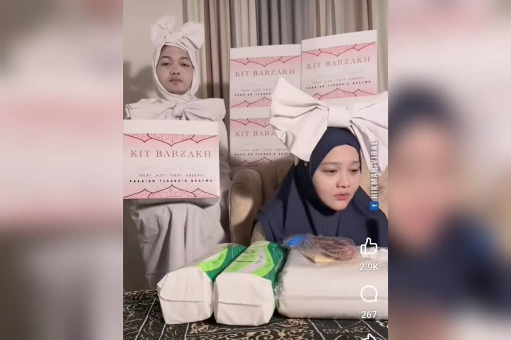 Tambah menarik siaran langsung yang dikendali wanita itu turut memaparkan aksi sebenar ‘jenazah’ yang mengenakan kain kafan yang dijual dalam kit jenazah terbabit.