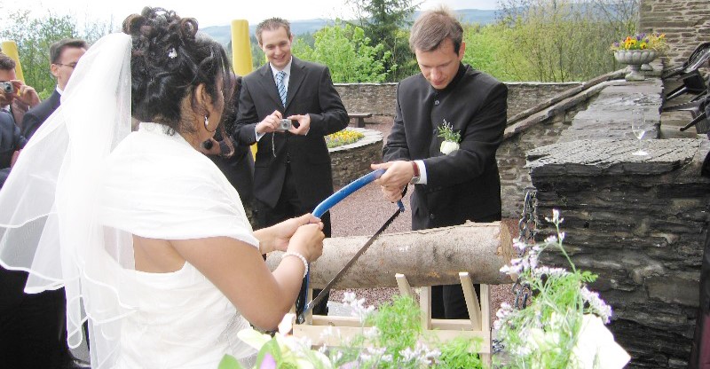 Pengantin baharu di Jerman menikmati tradisi yang dikenali sebagai Baumstamm Sagen, apabila pasangan itu perlu menggergaji kayu balak menjadi dua bahagian.