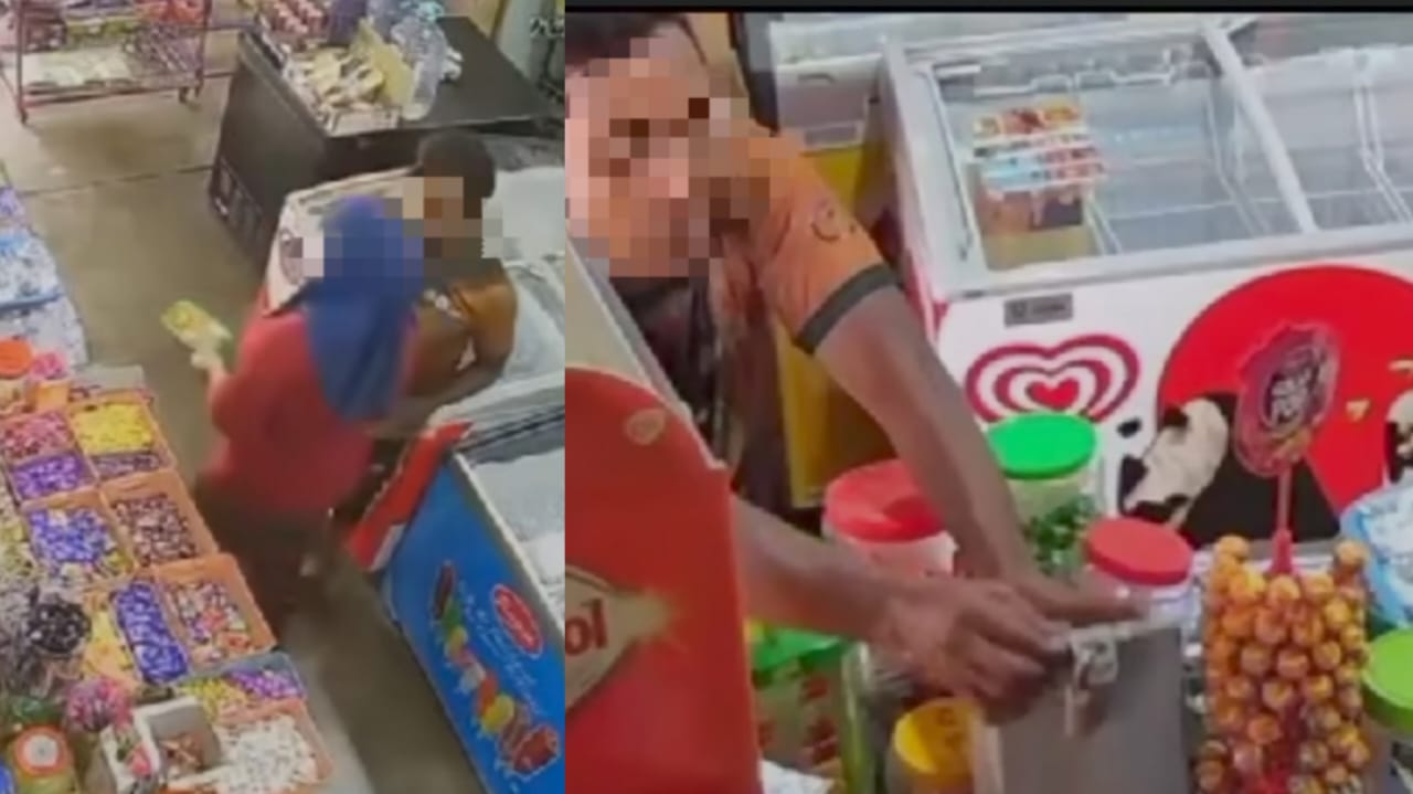 Kedua-dua mereka kemudiannya dilihat memasuki kedai runcit berkenaan sebelum suspek lelaki mengambil tabung derma yang berada di meja juruwang sebelum melarikan diri dengan menaiki motosikal.