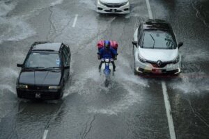 Dalam sebuah video lain, seorang lelaki dilihat bergegas membantu seorang pemandu penghantaran yang terjatuh dari motosikalnya akibat banjir.