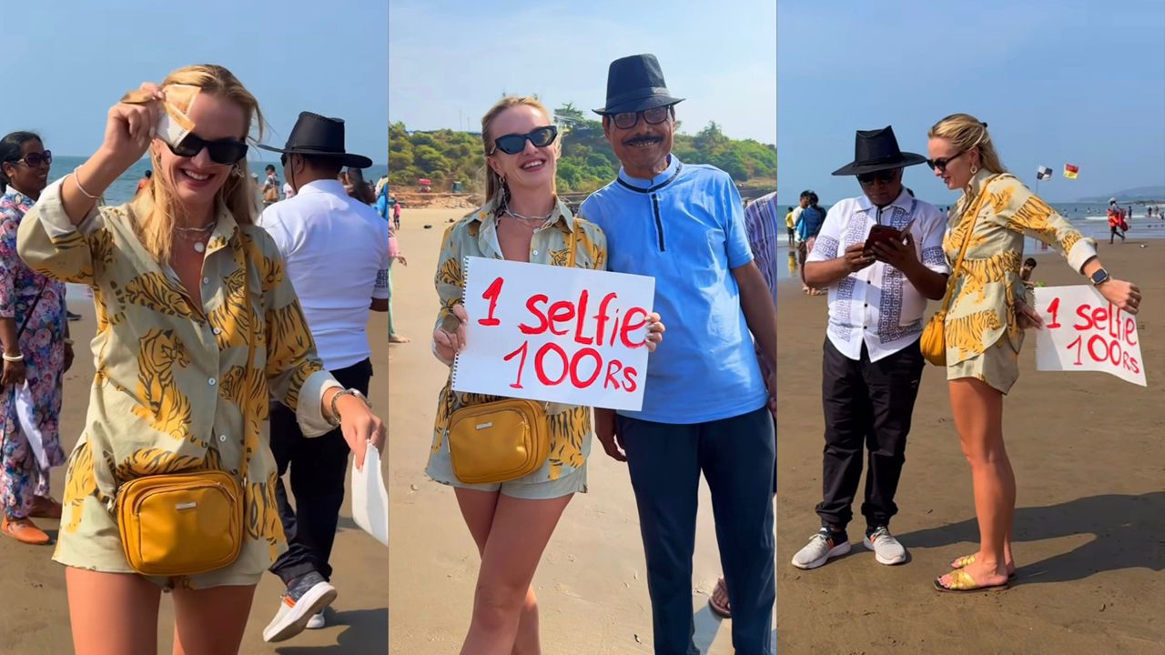 Rakaman dimuat naik di platform Instagram oleh akaun @@angelinali777 memaparkan wanita itu mengangkat sekeping kertas bertulis ‘1 swafoto 100 rupee’ di tepi pantai.