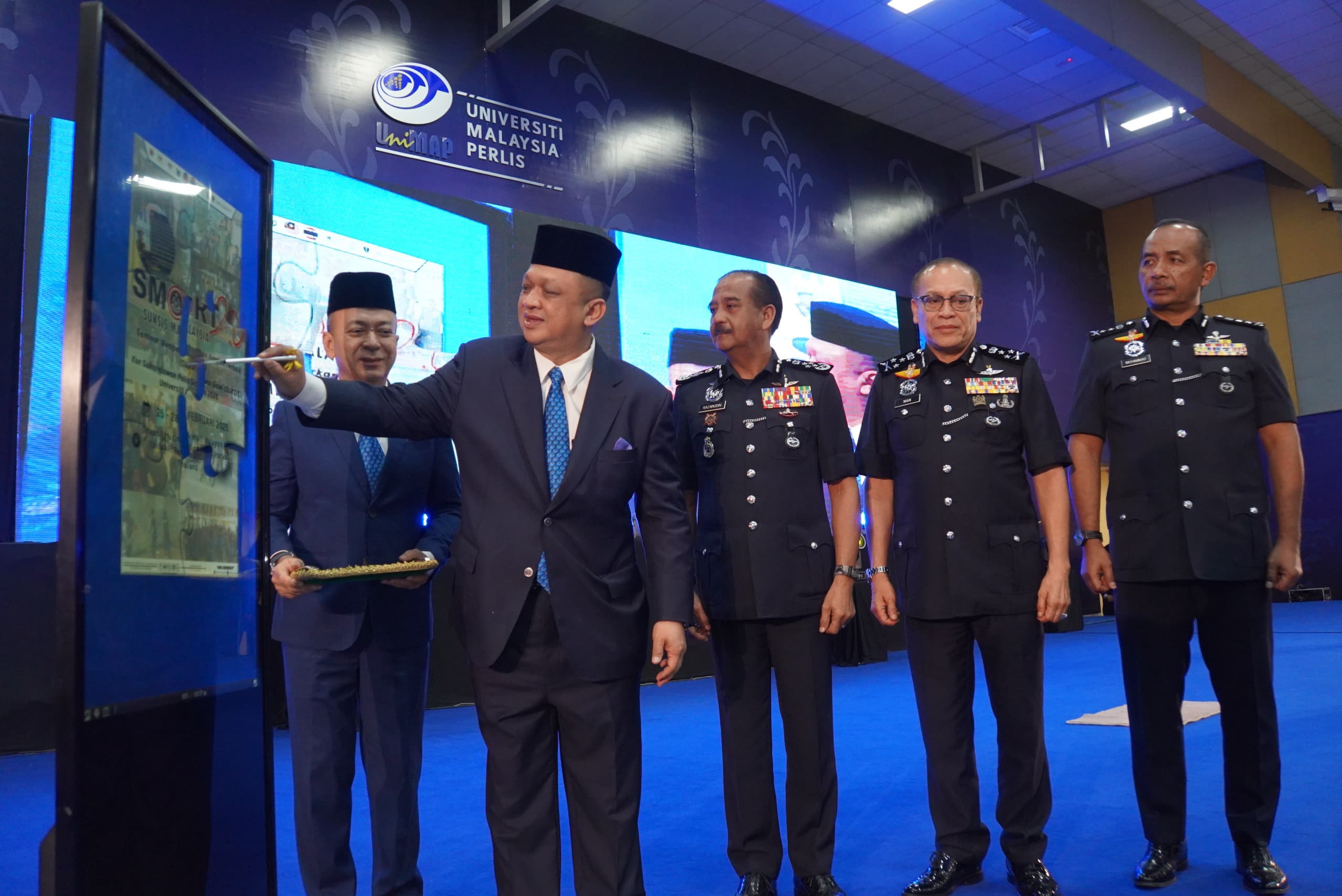 TUANKU Syed Faizuddin Putra Jamalullail (dua dari kiri) berkenan melancarkan perasmian penutup Seminar Memperkasakan Amalan Terbaik Kor Suksis Universiti Awam Peringkat Kebangsaan di Arau hari ini.