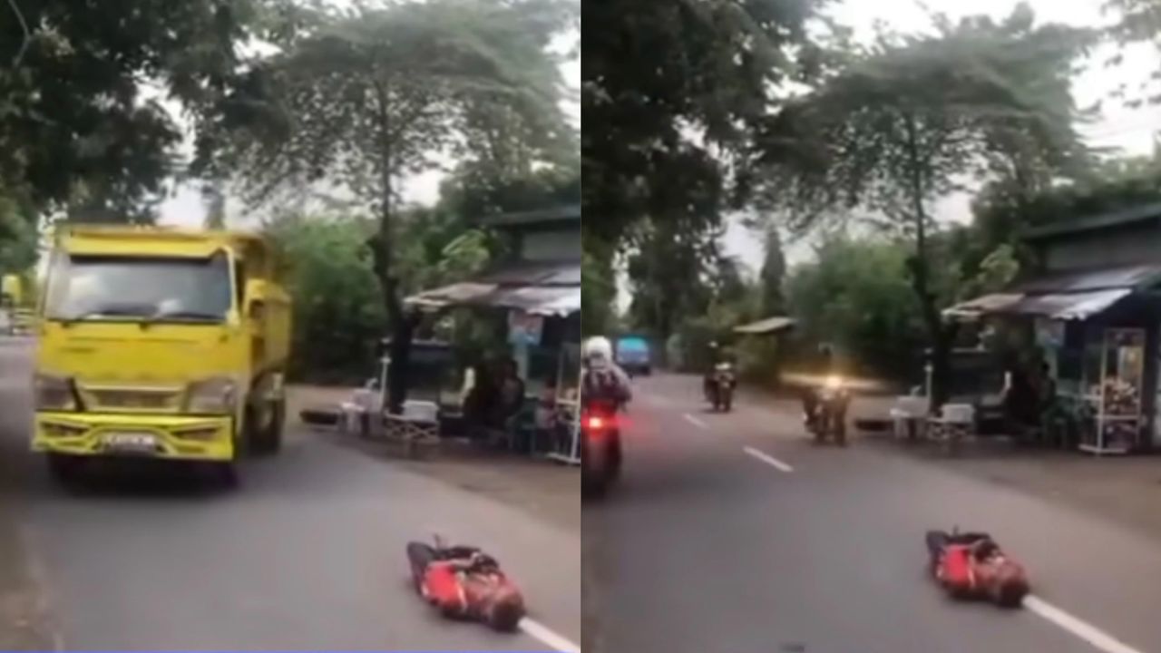 Rakaman dimuat naik di platform Instagram oleh akaun @viralkupang.ntt memaparkan lelaki itu terbaring di atas jalan yang sibuk.