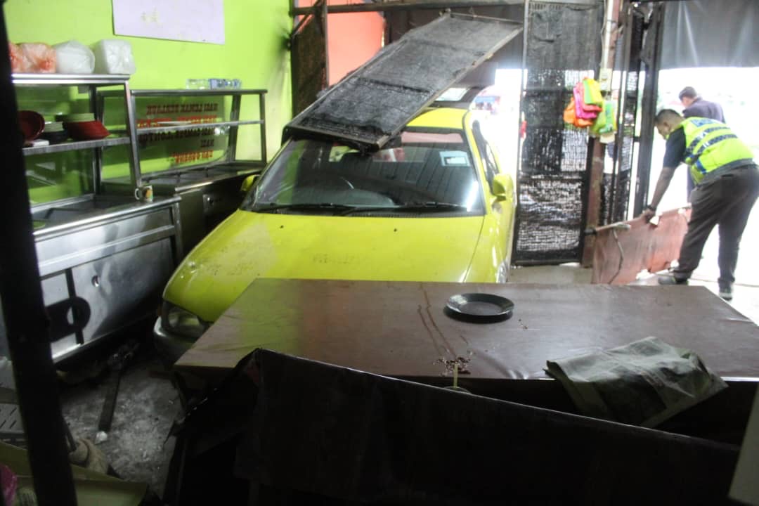 KEADAAN kereta dipandu mangsa yang merempuh sebuah gerai selepas terbabas di Jalan Malim Jaya, Melaka awal pagi tadi.