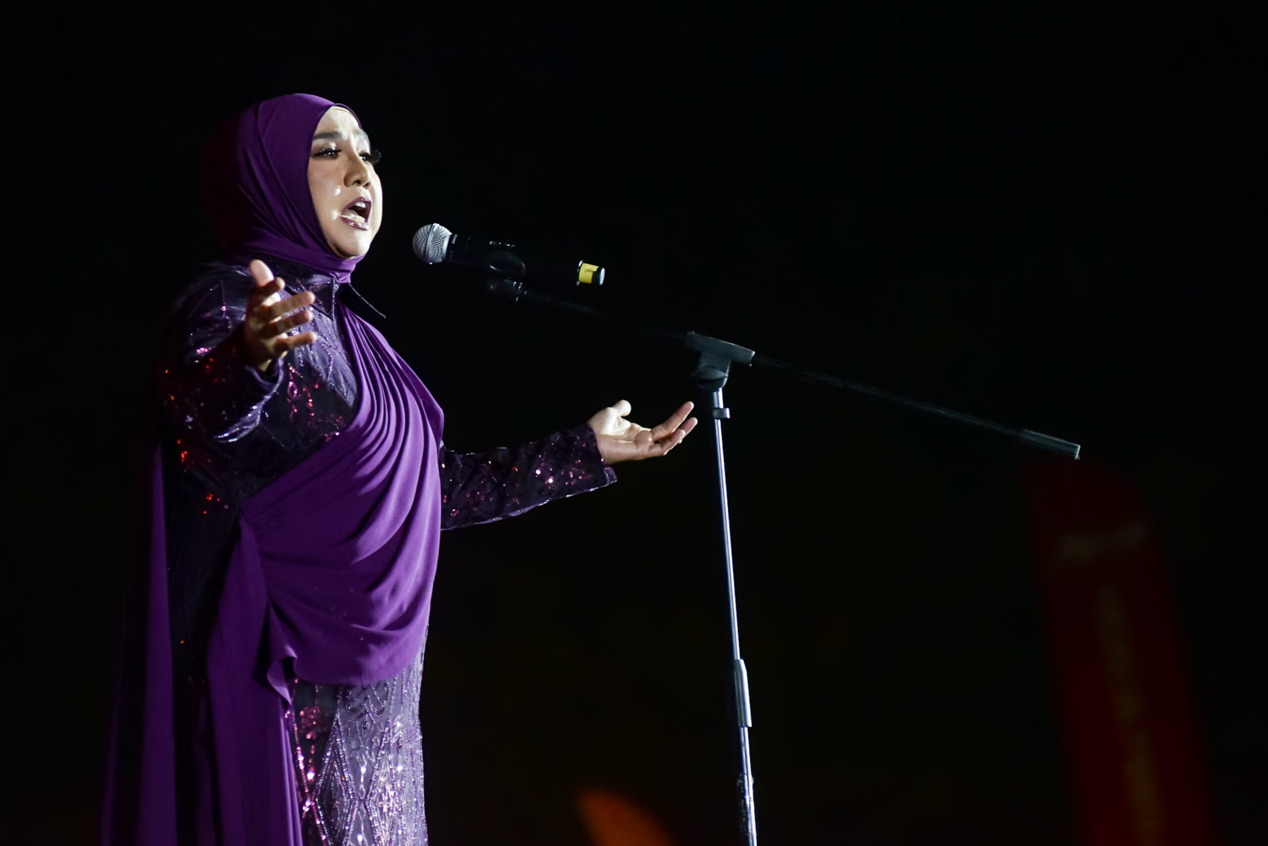 Nyanyiannya berlapis perasaan, membuatkan penonton basah dalam keindahan melodi, seolah-olah setiap bait menyentuh relung jiwa paling dalam.