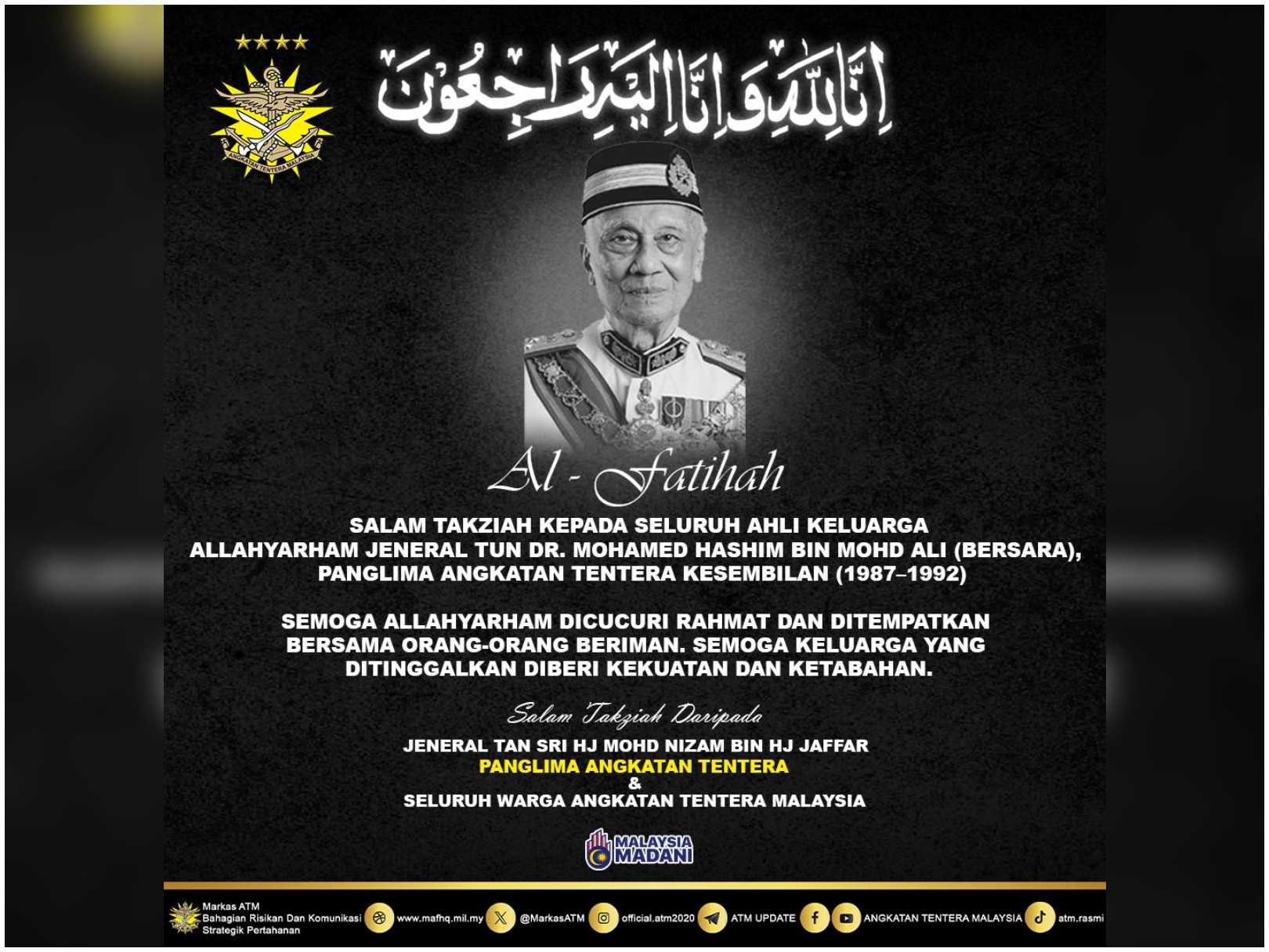 Ucapan takziah oleh Angkatan Tentera Malaysia atas pemergian Allahyarham Mohamed Hashim.