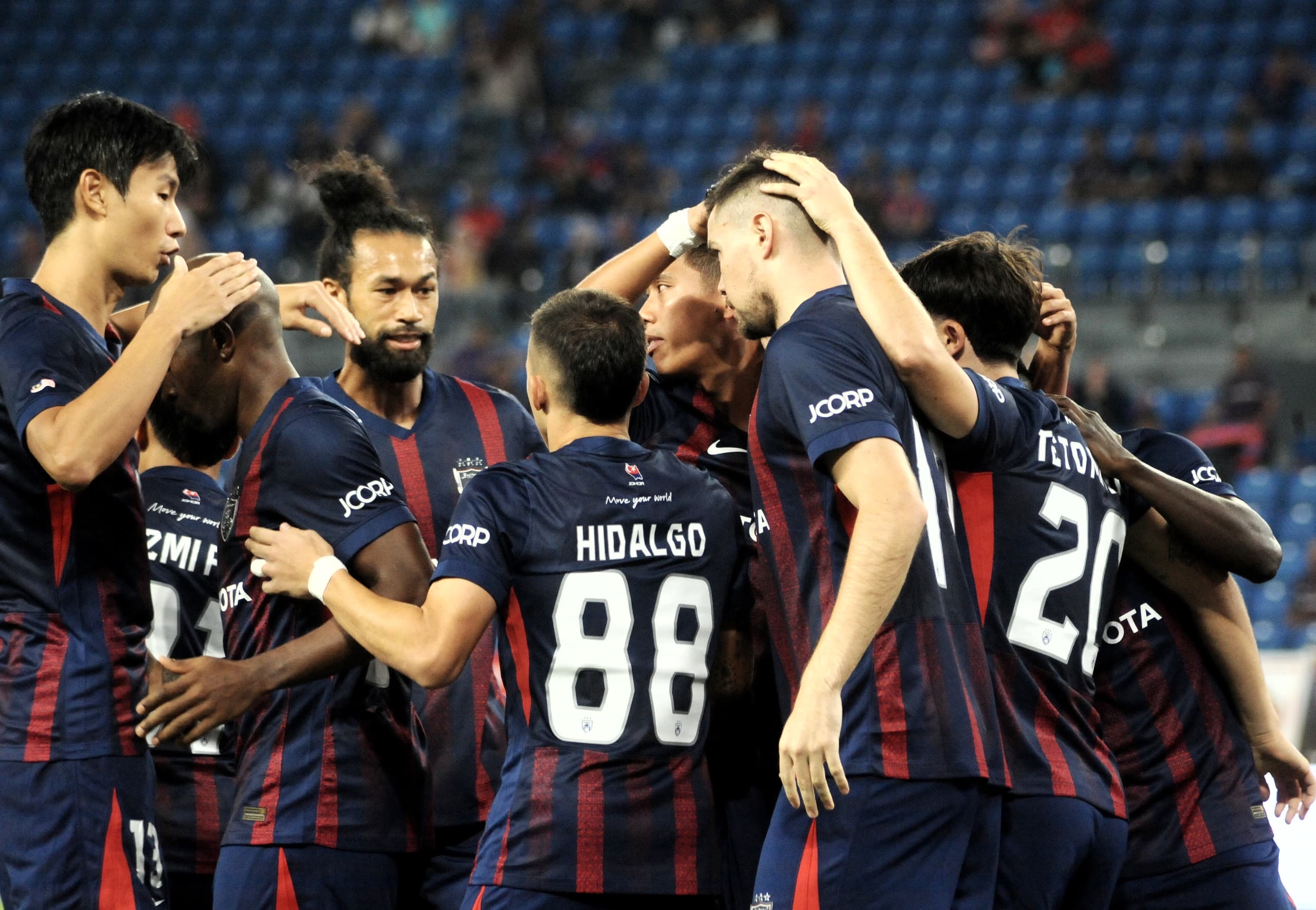 MORALES diraikan rakan sepasukan setelah menjaringkan gol pada perlawanan kedua pusingan 16 Piala FA menentang UM-Damansara United di Stadium Sultan Ibrahim, Iskandar Puteri hari ini. Foto RAJA JAAFAR ALI