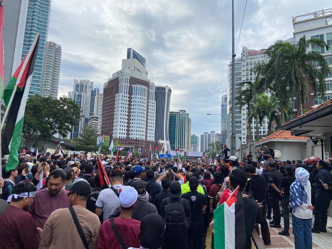 Terdahulu, ribuan peserta mula berarak dengan mengibarkan bendera Palestin di Jalan Tun Razak menuju ke Kedutaan Amerika Syarikat bermula pukul 4 petang tadi.