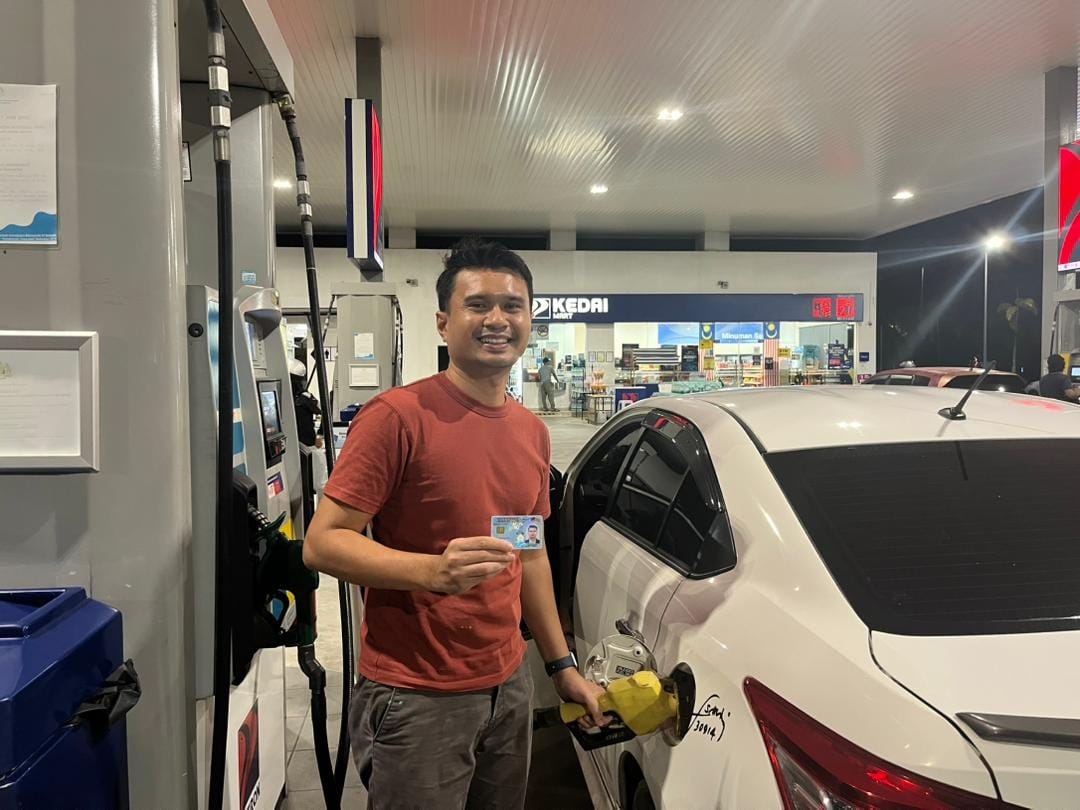 Ahmad Hafiyyan membayar petrol RON95 menggunakan inisiatif Budi95 di sebuah stesen minyak di Tok Jamal, Kuala Terengganu semalam.