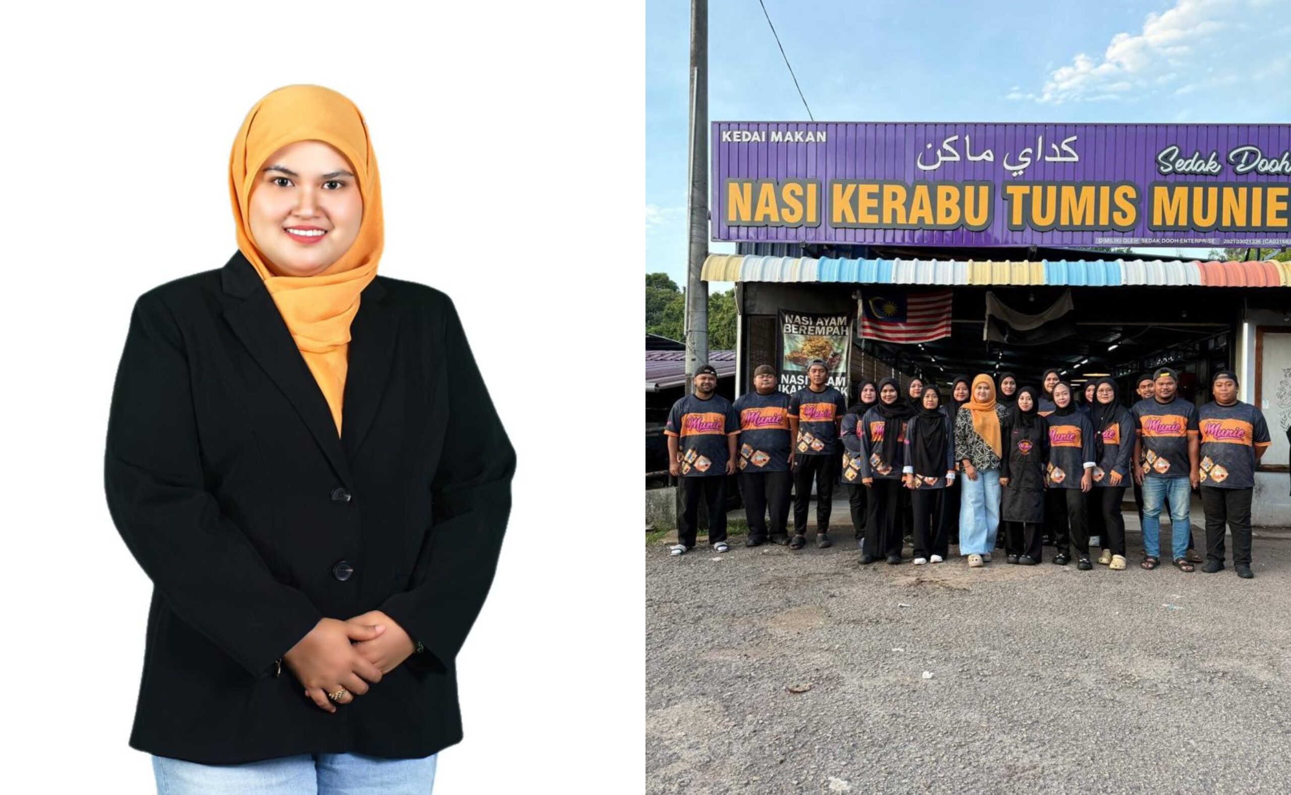 MUNIE yang merupakan wanita kelahiran Kuantan, Pahang berdiri bersama stafnya di depan cawangan kedua Nasi Kerabu Tumis Munie di Bandar Indera Mahkota, Kuantan.