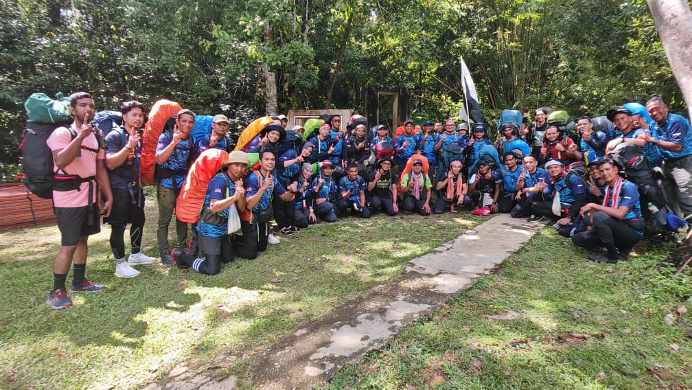 Fadzli bersama peserta dan malim gunung yang menyertai Ekspedisi Kelestarian Trek Gunung Tahan (Merapoh-Kuala Tahan) 2025 di Sungai Relau, Merapoh dekat Lipis semalam.