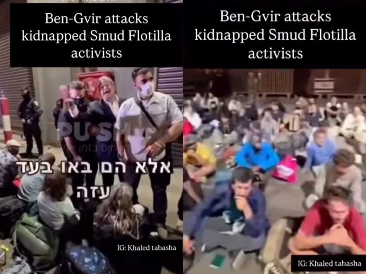 Menerusi video tular di media sosial, Ben-Gvir hadir di hadapan aktivis dan sukarelawan yang ditahan oleh tentera Zionis Israel, malah dia turut memasuki salah satu kapal serta menuduh kononnya terdapat bahan kimia di situ.