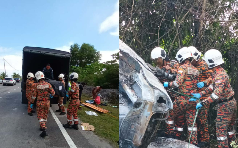 “Seorang mangsa ditemukan di luar manakala seorang lagi di dalam kereta. Anggaran kemusnahan kereta jenis Proton Saga BLM berwarna perak itu adalah sebanyak 80 peratus.