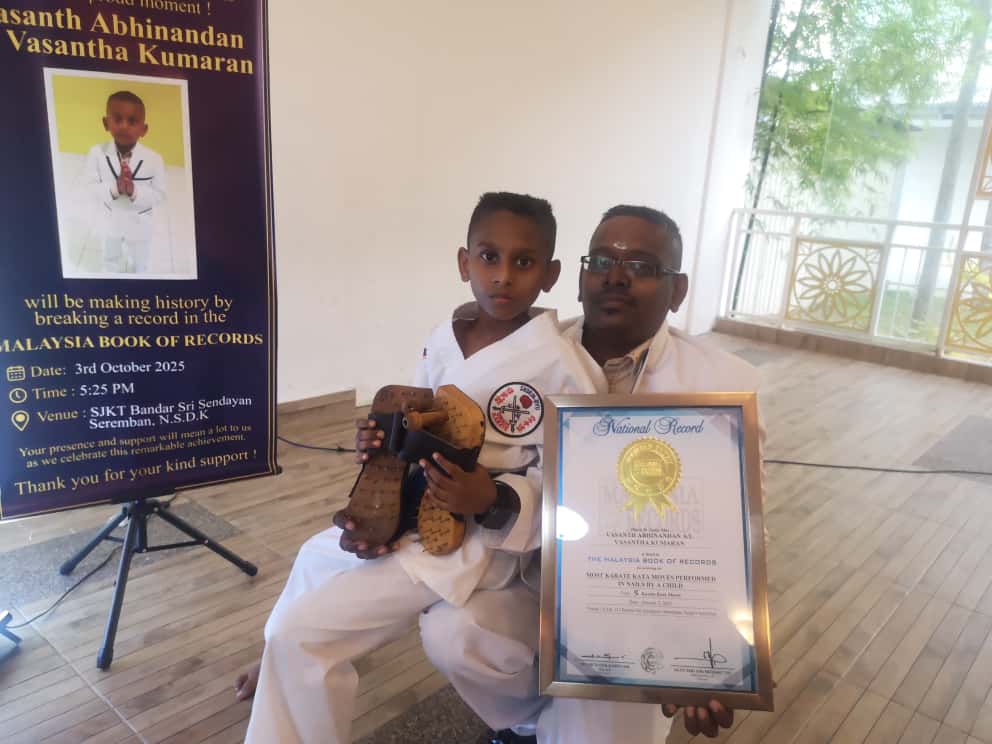 SEREMBAN – Seorang murid berusia lapan tahun, V. Vasanth mencipta rekod Malaysia Book of Records (MBOR) sebagai murid pertama di negara ini mempersembahkan gerakan kata karate di atas kasut berpaku selama 10 minit.