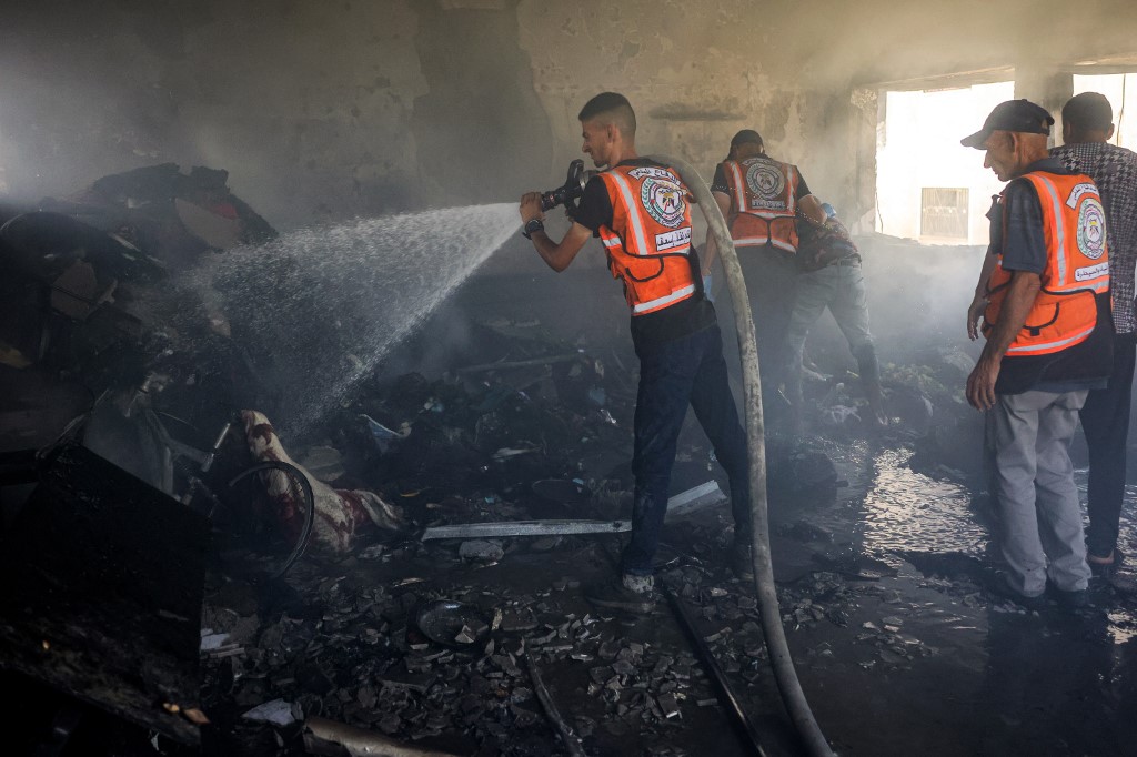 Anggota pertahanan awam Palestin memadamkan api selepas serangan Israel di sebuah sekolah di barat Jabalia, utara Gaza pada 27 Jun lalu. - AFP