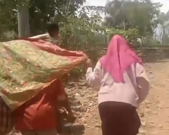 Rakaman video dimuat naik di media sosial menunjukkan warga setempat mengusung wanita terbabit menggunakan pengusung yang diperbuat daripada batang buluh.