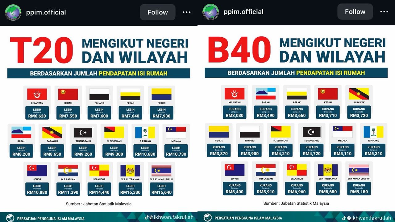 Menerusi hantaran di Threads oleh Ct_zaa, Persatuan Pengguna Islam Malaysia (PPIM) berkongsi infografik menunjukkan pendapatan isi rumah sebanyak RM6,620 dikategorikan sebagai T20 di Kelantan, namun hanya berada dalam kumpulan B40 di Kuala Lumpur yang ditakrifkan sebagai pendapatan di bawah RM9,150.