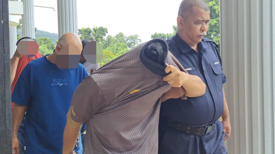 Suspek (depan, kiri) ketika dibawa reman di Mahkamah Balik Pulau, Rabu lalu.