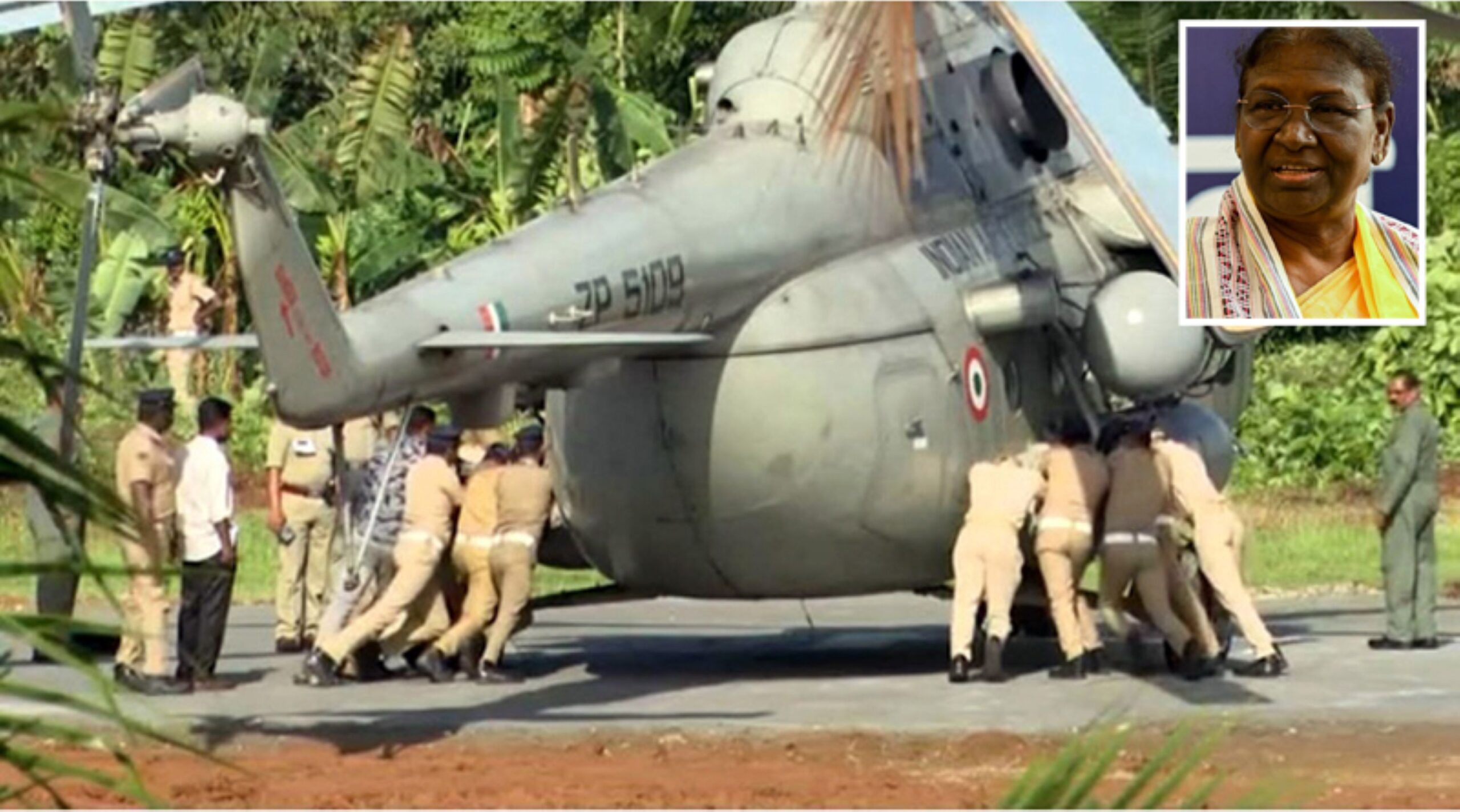 HELIKOPTER membawa Droupadi Murmu (gambar kecil) tersangkut di kampung Pramadom. - Foto UNI/AFP