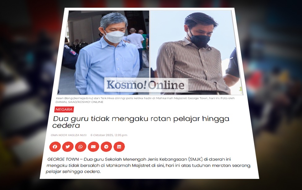 Sebelum ini media melaporkan dua guru Sekolah Menengah Jenis Kebangsaan (SMJK) di Georgtown, Pulau Pinang mengaku tidak bersalah di Mahkamah Majistret atas tuduhan merotan seorang pelajar sehingga cedera.