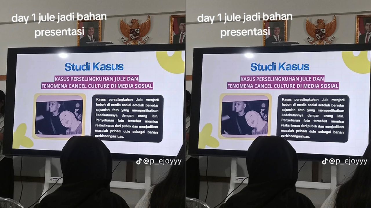 Imej dimuat naik di platform TikTok oleh akaun @p_ejoyyy menunjukkan beberapa pelajar sedang melakukan pembentangan bertajuk ‘Kes Kecurangan Jule dan Fenomena Batal Budaya (Cancel Culture) di Media Sosial’.