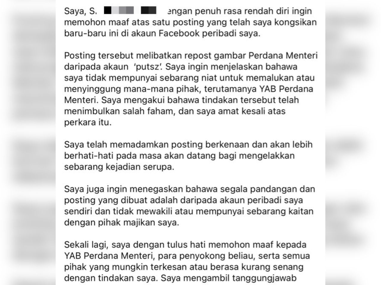 “Saya ingin menjelaskan bahawa saya tidak mempunyai sebarang niat untuk memalukan atau menyinggung mana-mana pihak, terutamanya Perdana Menteri.