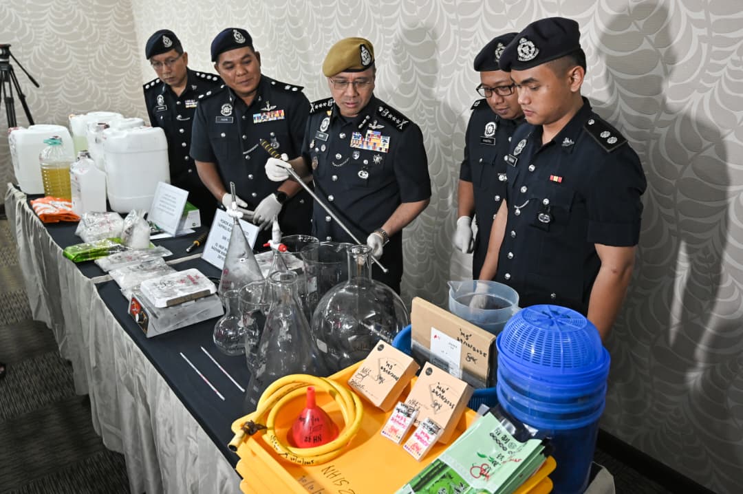 “Pemeriksaan di rumah itu turut menjumpai cecair disyaki mengandungi dadah seberat 84.75 liter. Selain itu, turut ditemui beberapa peralatan dan bahan kimia dipercayai untuk proses pembersihan semula methamphetamine yang tidak berkualiti sebelum dijual di pasaran,” katanya dalam sidang akhbar di sini hari ini.