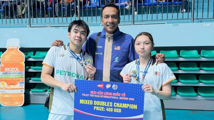 HAZWAN (tengah) memuji prestasi Ziheng dan Noraqilah selepas menjuarai IS Vietnam di Bac Giang semalam.