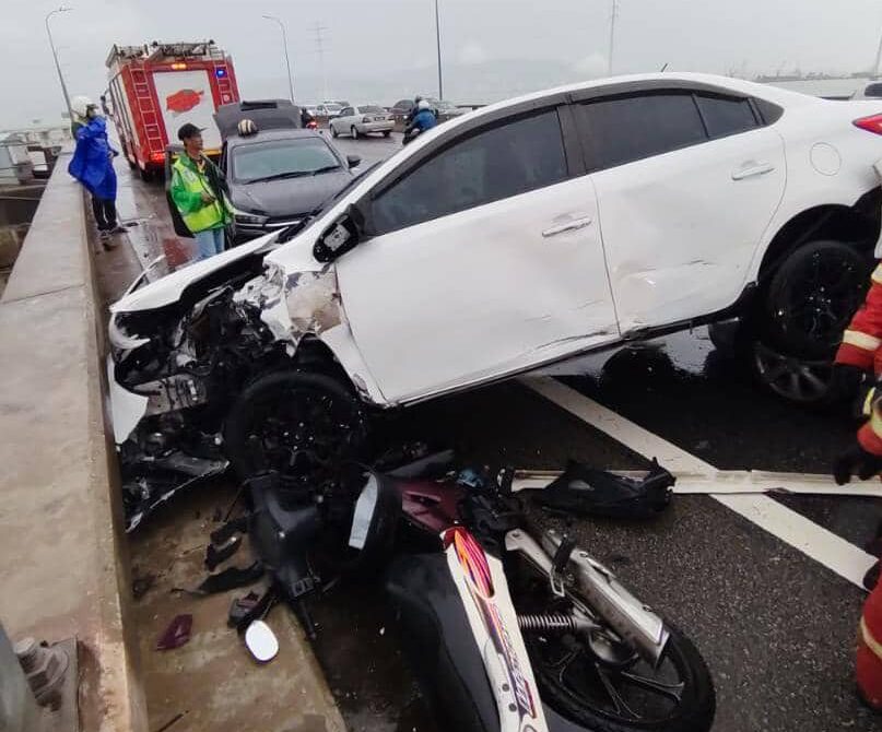 GEORGE TOWN – Seorang lelaki cedera selepas motosikal yang dia tunggang terlibat dalam kemalangan membabitkan lima kenderaan di Kilometer 2.2 Jambatan Pulau Pinang dari arah pulau menghala ke Perai di sini, hari ini.
