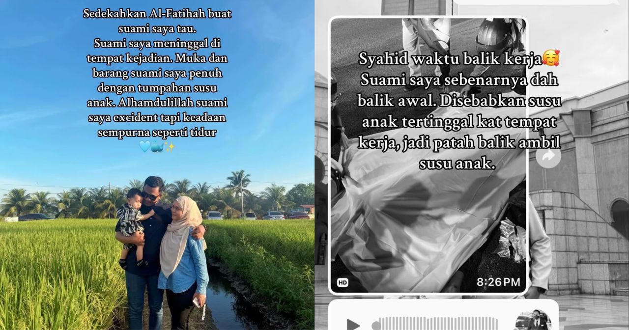 “Sedekahkan Al-Fatihah buat suami saya tau. Suami saya meninggal di tempat kejadian. Muka dan barang suami penuh dengan tumpahan susu anak. Alhamdulillah suami saya kemalangan, tapi keadaannya sempurna seperti tidur,” katanya.