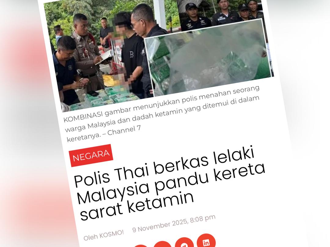 Kosmo! sebelum ini melaporkan seorang lelaki Malaysia ditahan di sebuah pos pemeriksaan di wilayah Chumphon, selatan Thailand selepas polis menemui 75 kilogram dadah ketamin bernilai lebih 70 juta baht(RM9 juta) di dalam but kereta yang dipandunya.