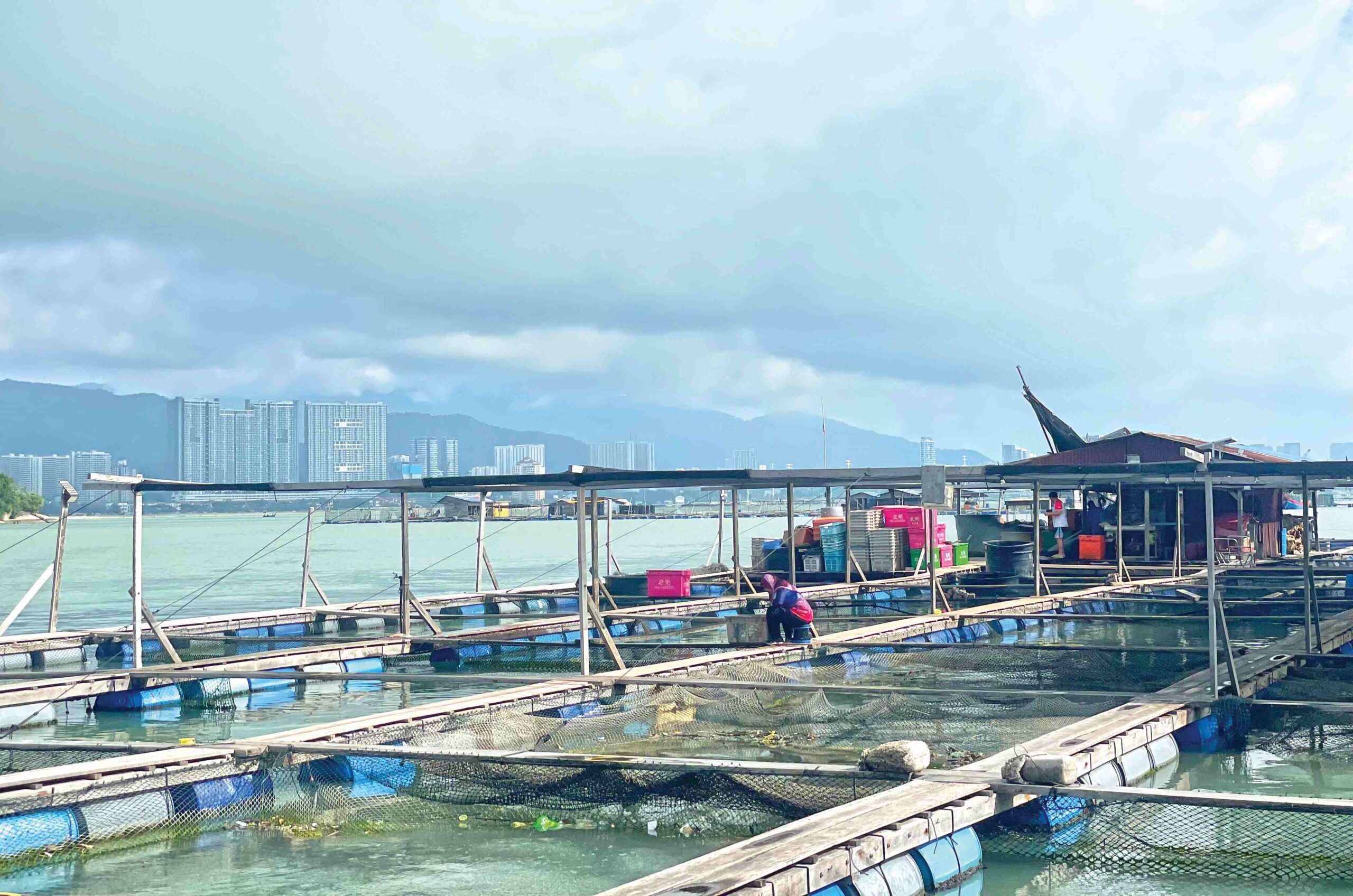 Suasana di atas sangkar ikan, umpan akan dihulur di celah-celah sangkar dan papan laluan pejalan kaki.