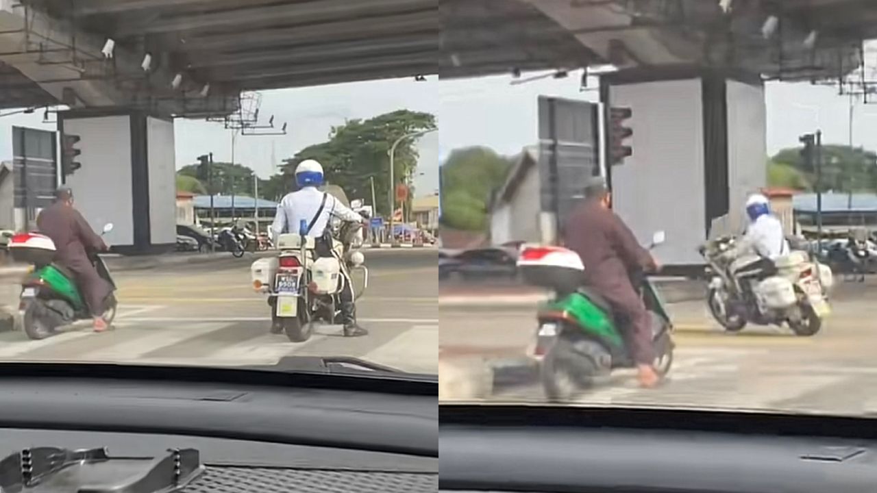 PETALING JAYA – Tindakan seorang lelaki berkopiah yang menunggang motosikal dilihat tenang walaupun berada bersebelahan anggota polis trafik ketika berhenti di lampu isyarat.