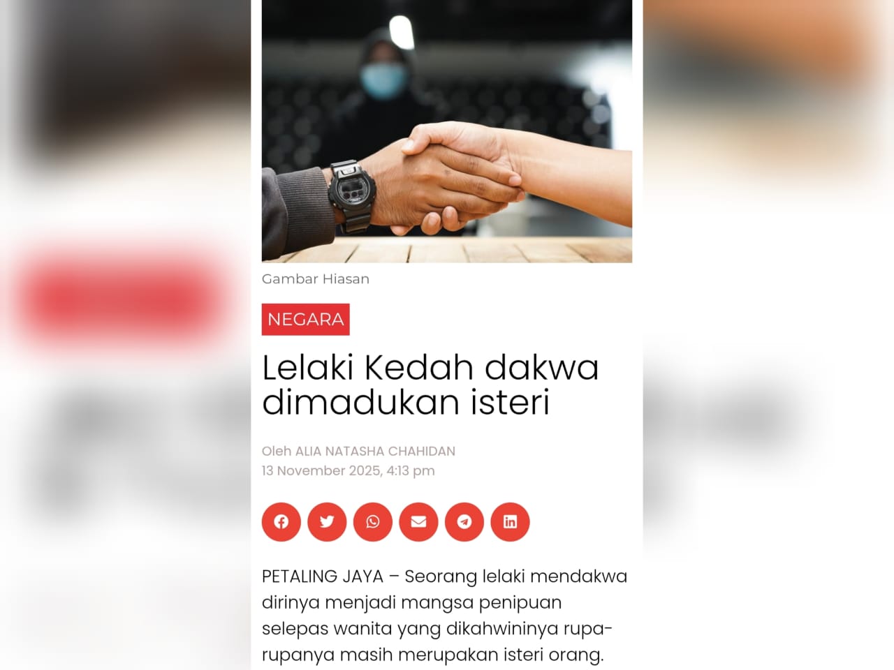Akhbar ini melaporkan seorang lelaki mendakwa dirinya menjadi mangsa penipuan selepas wanita dikahwini rupa-rupanya masih bergelar isteri orang. – KOSMO! ONLINE