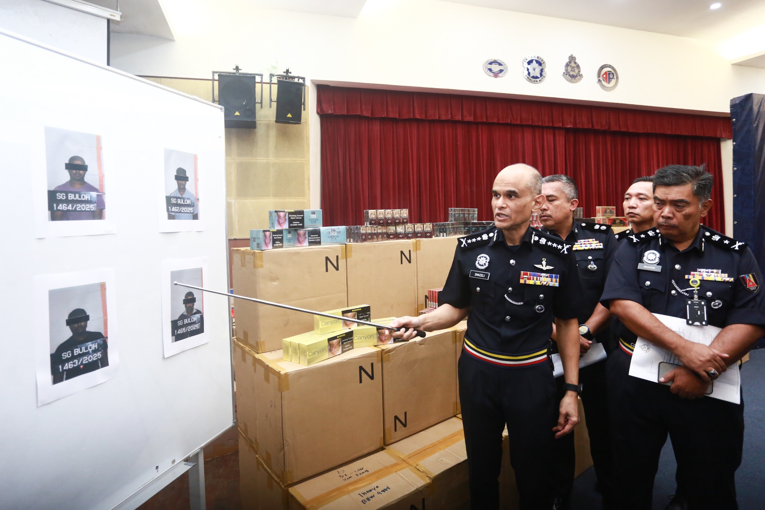 Ketua Polis Selangor Datuk Shazeli Kahar menunjukkan antara suspek yang ditahan susulan kejayaan membongkar sindiket rokok seludup pada sidang akhbar di Shah Alam kelmarin.