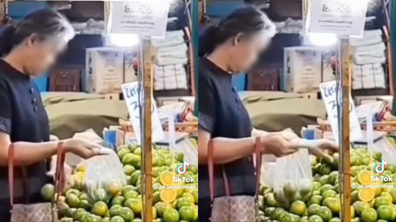 Rakaman video dimuat naik di platform TikTok oleh akaun @akangmisman menunjukkan wanita sudah berusia itu sedang memilih buah limau dia sebuah pasar.