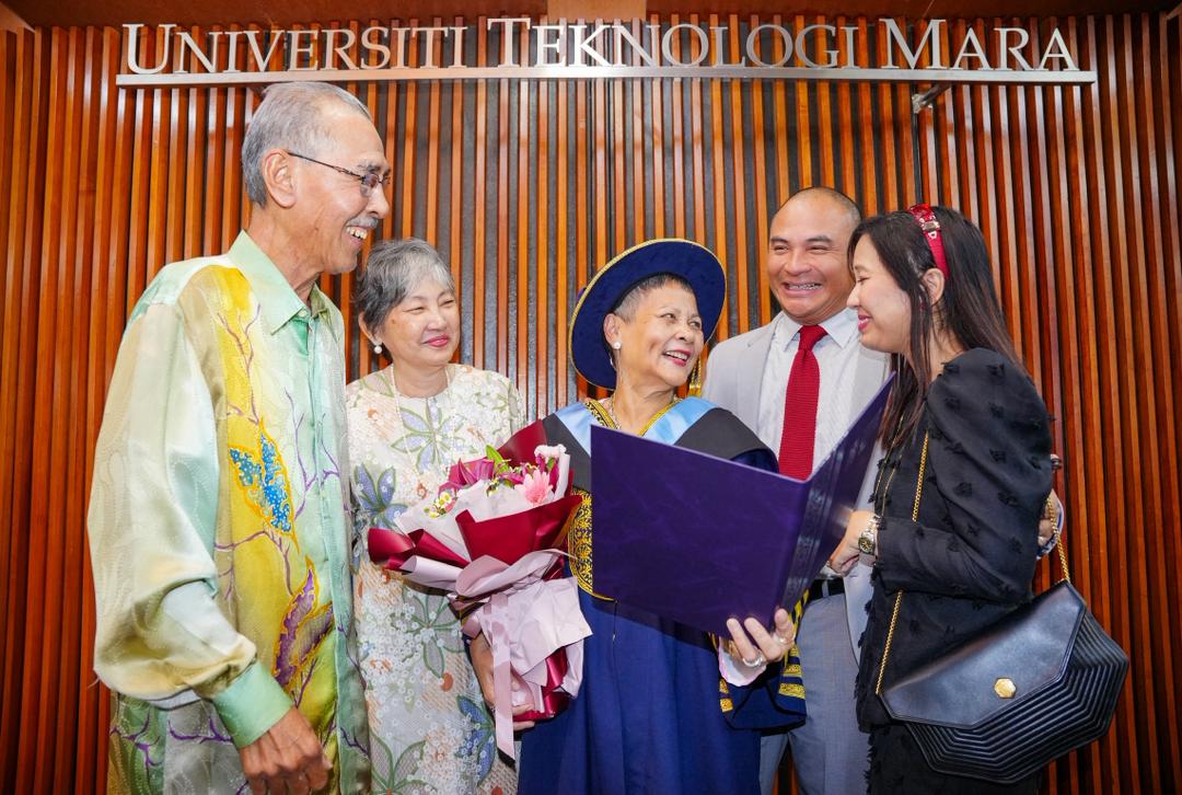 SHAH ALAM – Usia bukan penghalang buat seorang nenek empat cucu apabila memperoleh Doktor Falsafah (PhD) bidang pendidikan sempena Istiadat Konvokesyen ke-103 Universiti Teknologi Mara (UiTM) di sini hari ini.