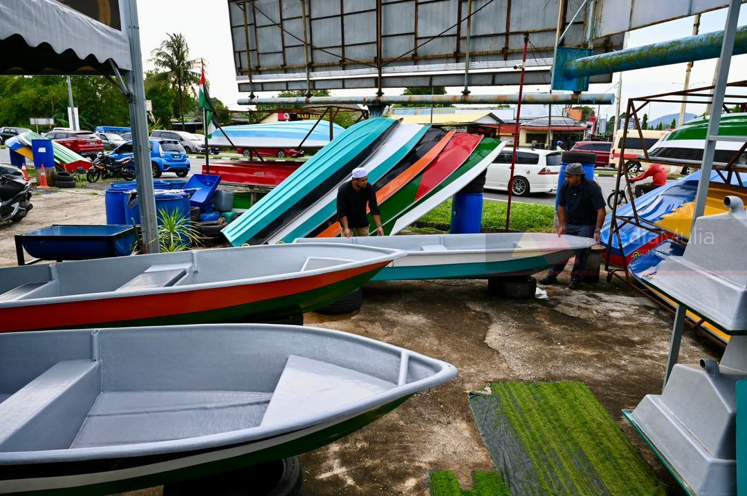Masduki sedang memeriksa bot fiber jualan di kedainya di Kampung Tebauk, Kuala Nerus kelmarin.
