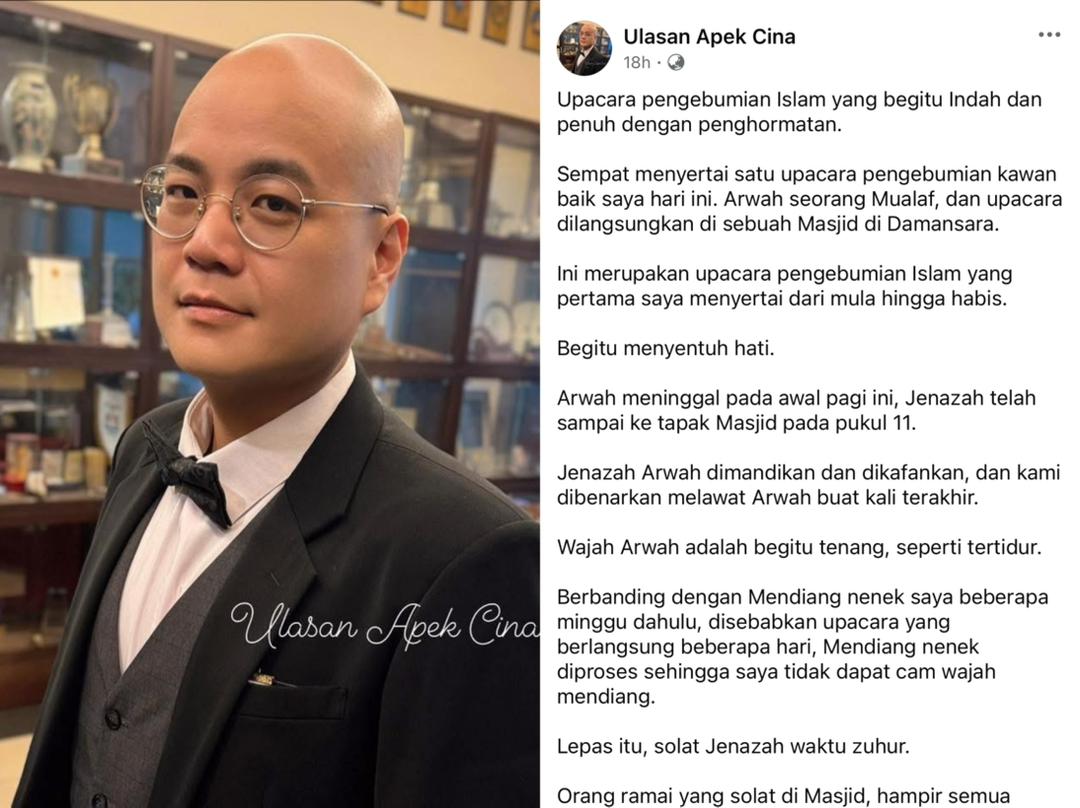 Menerusi hantaran di laman Facebook Ulasan Apek Cina, lelaki tersebut tersentuh hati dengan upacara pengebumian orang Islam yang dianggap penuh dengan penghormatan.