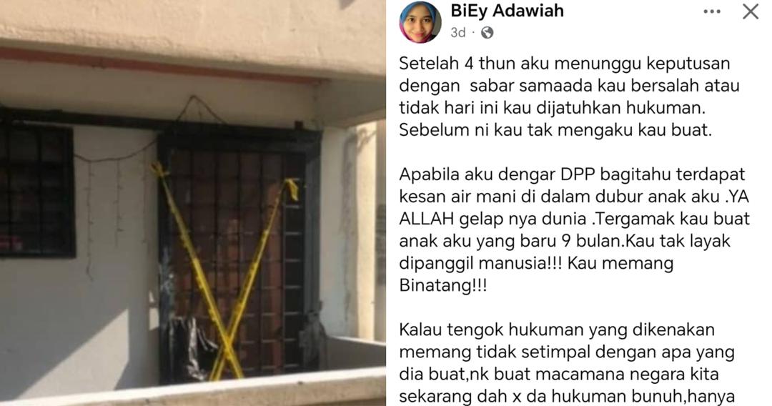 Menerusi hantaran di Facebook, pengguna akaun BiEy Adawiah mengakui berasa kesal dengan tindakan pelakunya iaitu suami kepada pengasuh anaknya yang sanggup melakukan perbuatan terkutuk tersebut.