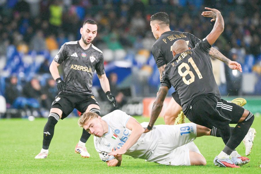 HOJLUND (tengah) dijatuhkan dalam kotak penalti ketika Napoli menang 2-0 ke atas Qarabag awal pagi semalam. - AFP