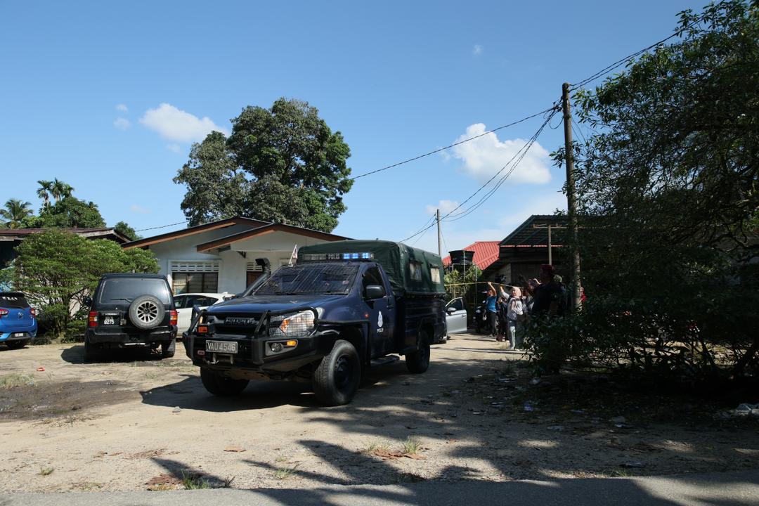 Trak polis membawa mayat mangsa keluar dari lokasi kejadian di Kampung Paku, Gual Ipoh dekat Tanah Merah hari ini. FOTO KAMARUL BISMI KAMARUZAMAN/KOSMO!