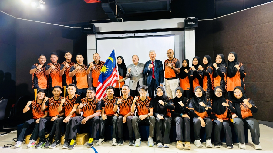 NASIR (belakang, tengah) ketika hadir menyempurnakan penyerahan Jalur Gemilang kepada skuad petanque negara ke Sukan SEA 2025 di Wisma MOM hari ini.