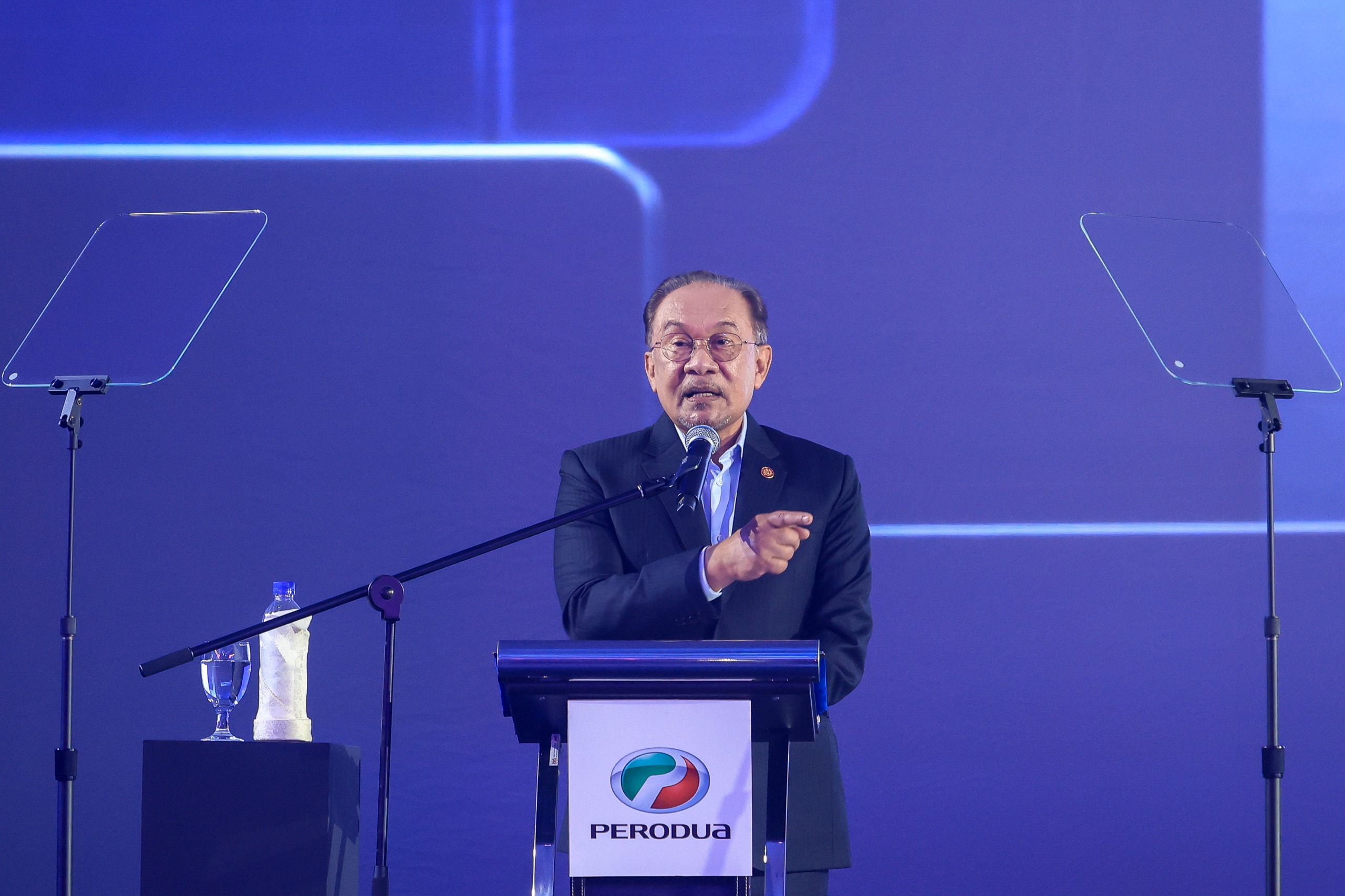 Anwar berucap merasmikan Majlis Peluncuran EV Pertama Perodua di Dewan Perdana MITI, Kuala Lumpur hari ini. Foto oleh FARIZ RUSADIO / KOSMO!