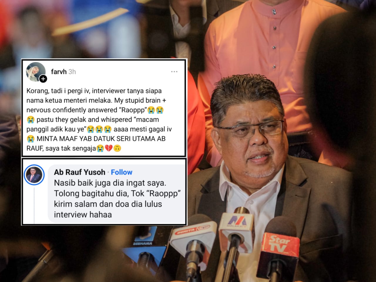 PETALING JAYA – Seorang gadis mengundang gelak ketawa pengguna media sosial apabila tidak sengaja menggunakan panggilan ‘Raop’ ditujukan kepada Ketua Menteri Melaka, Datuk Seri Ab. Rauf Yusoh sewaktu menjawab soalan sesi temu duga kerja.