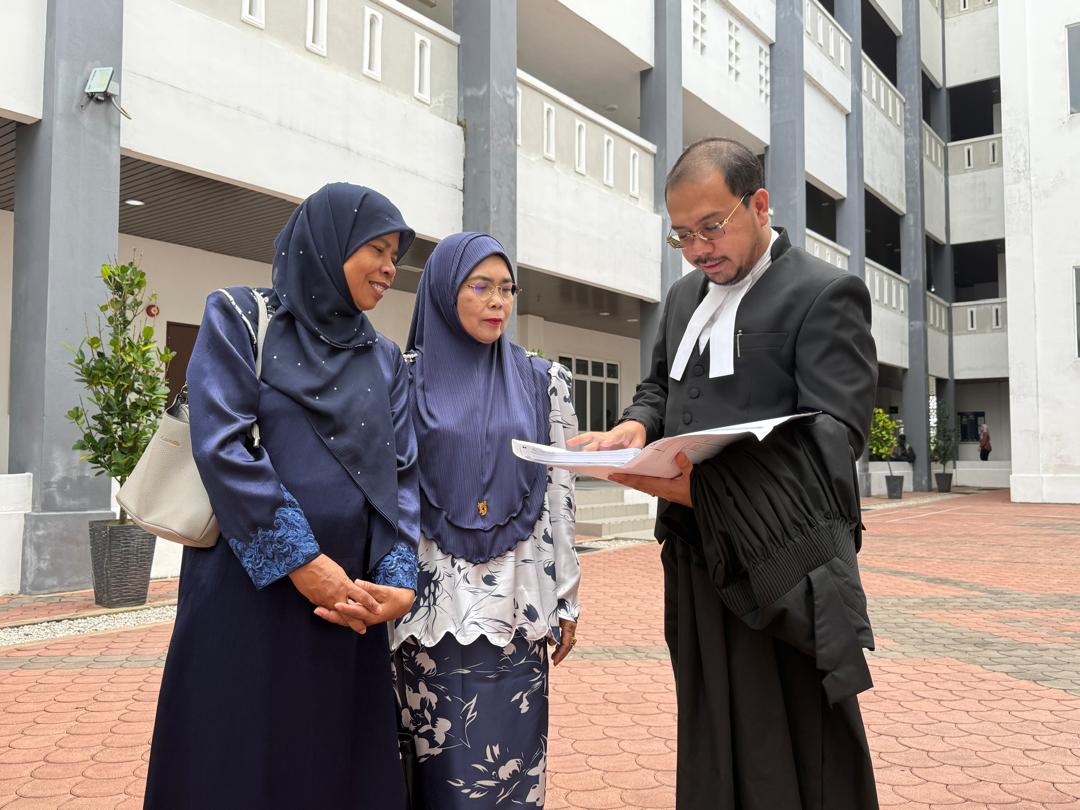 Nik Saiful (kanan) berbincang dengan Mahani (kiri) dan Sharifah ketika hadir ke Mahkamah Tinggi Kota Bharu, Kota Bharu hari ini.