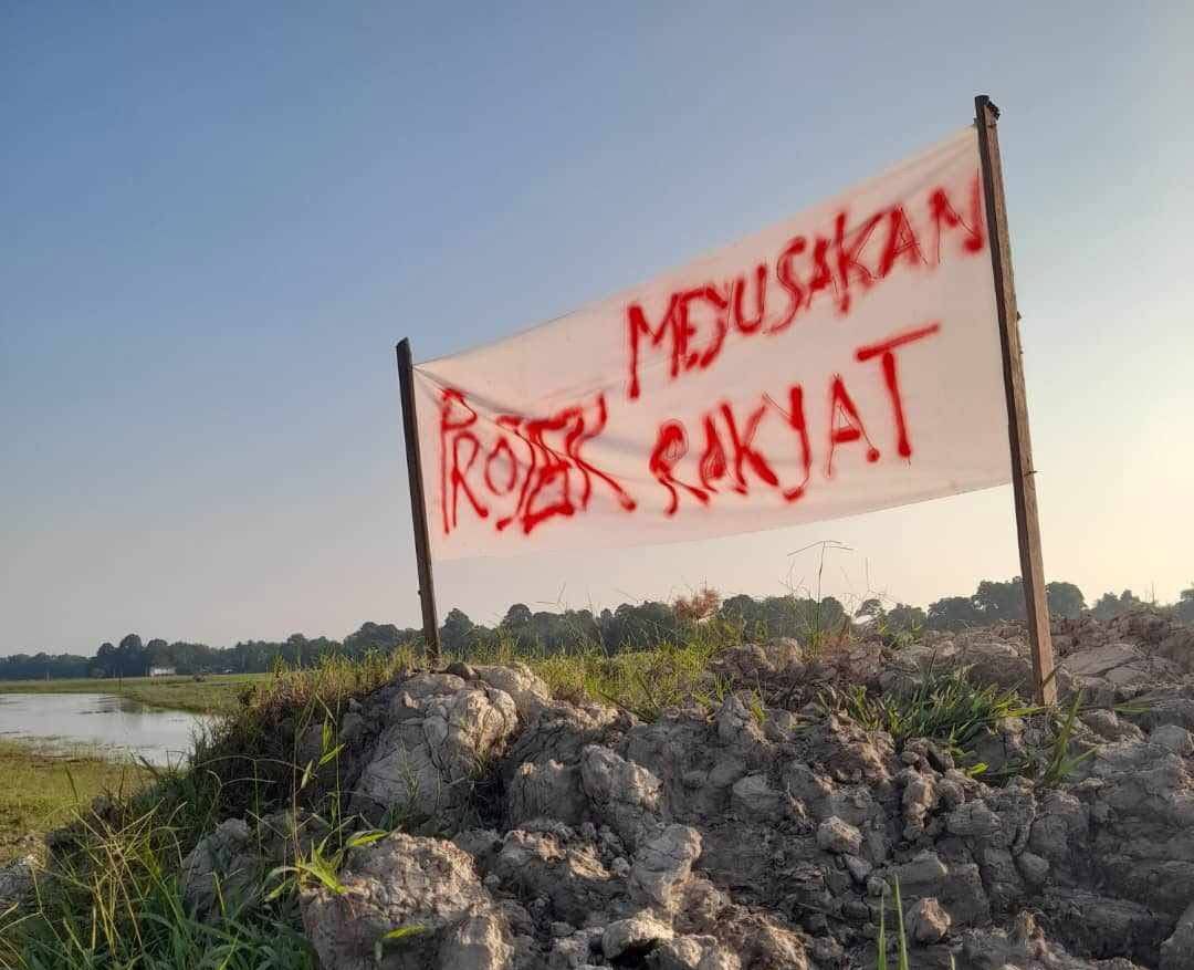 Lima kain rentang dengan tulisan Projek Menyusahkan Rakyat, Banjir#LubangAir, Tolonglah Bantu Kami PMX, Jalan Maut dan Sungguh Malang Nasib Kami dipasang di kampung itu tular di media sosial.