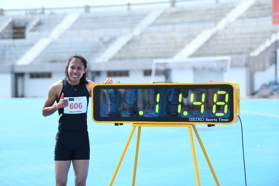 HUSNIAH bersama papan skor yang menunjukkan catatan rekod 100m kebangsaannya pada Terbuka Perlis tahun lalu.