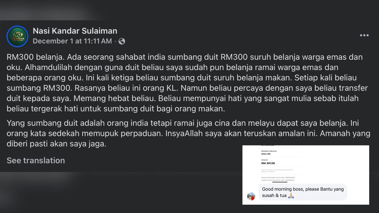 Menerusi perkongsian di Facebook oleh Nasi Kandar Sulaiman, lelaki itu memberi RM300 kepada pihak restoran setiap kali sumbangan.